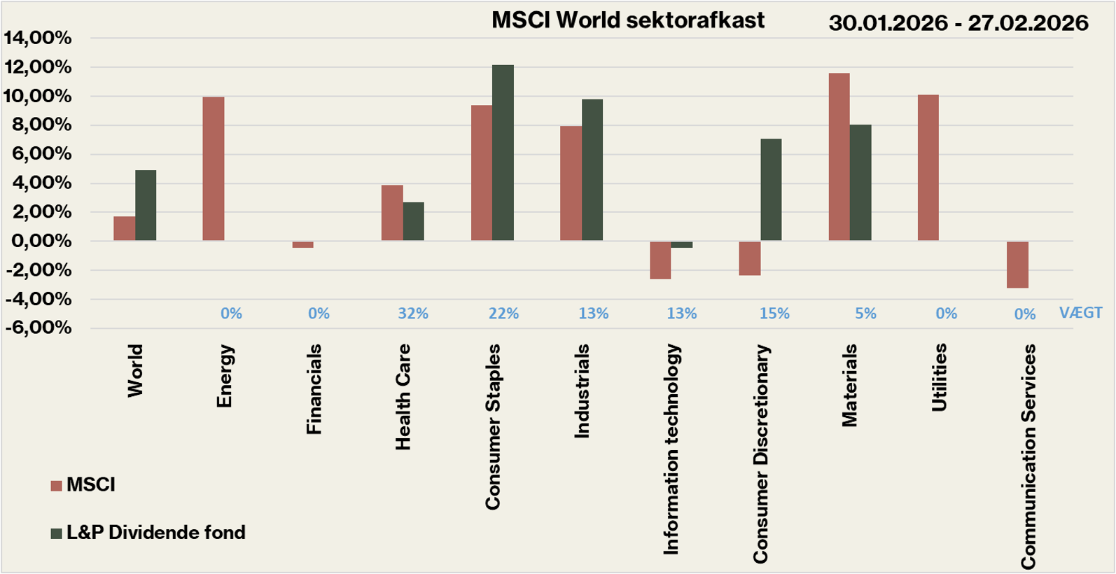 I februar måned var det især fondenes investeringer i sektoren Consumer Staples som bidrog positivt til afkastet. Derimod var IT-sektoren igen præget af kursfald.