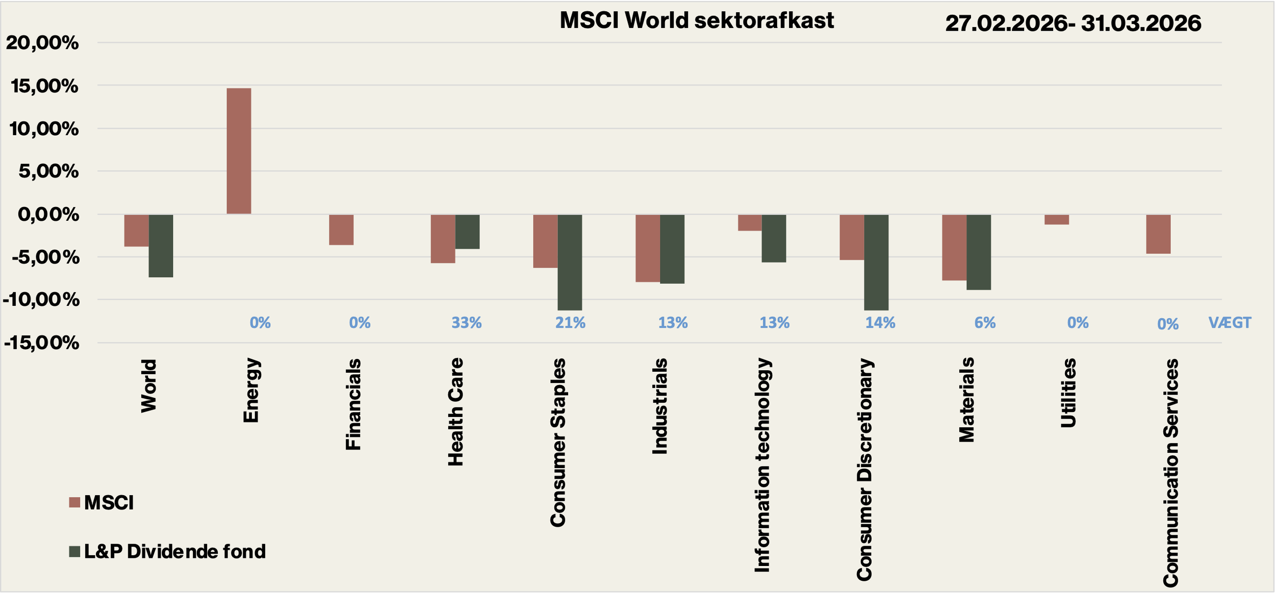 I løbet af marts måned blev alle sektorer, undtagen som tidligere nævnt sektoren Energi, presset og kursfaldene har ovenpå Iran krigen været store og voldsomme.